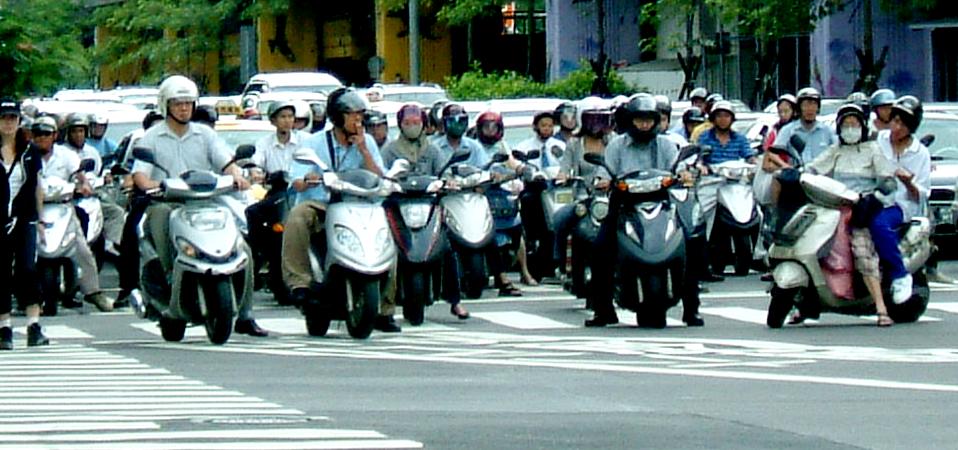 The practical benefits of wearing a proper helmet are, of course, obvious. And the predictable downside of wearing hats instead of helmets is the potential danger to the human skull. Combine a lack of protection with the bedlum of traffic in Taiwan and you have a potent recipe for death. In fact, 70% of all traffic fatalities in Taipei City are scooter operators. Many are victims of the greater problem in Taiwanese society: the lack of respect for traffic laws, drink-driving, and the lack of effeciency in policing Taiwan's roads. A trip around the island by car is a tour of traffic lunacy. In the mountains, buses and scooters overtaking cars on blind corners. Cliff-hugging roads with inappropriate barriers. People running red lights. Cars and motorcyclists not yielding to emergency vehicles. There are few guarantees as a pedestrian in Taiwan. Chaos is the law. Drivers and street-walkers alike seem to have developed a sixth sense for predicting traffic. Most of the time scooters and cars weave through the streets in schools with a kind of chaotic harmony, but it takes so little for that harmony to be broken.